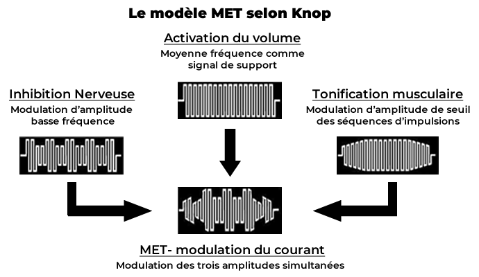 Contrairement au dispositif TENS plus connu, qui a principalement un effet analgésique à court terme en couvrant les informations sur la douleur avec une fréquence hertzienne plus élevée, la thérapie modulée AMPLIVET® peut spécifiquement traiter les différentes structures tissulaires dans le but d’améliorer et accélérer le processus de guérison. Un courant alternatif moyenne fréquence sert de support à deux enveloppes à basse fréquence modulables indépendamment l'une de l'autre :